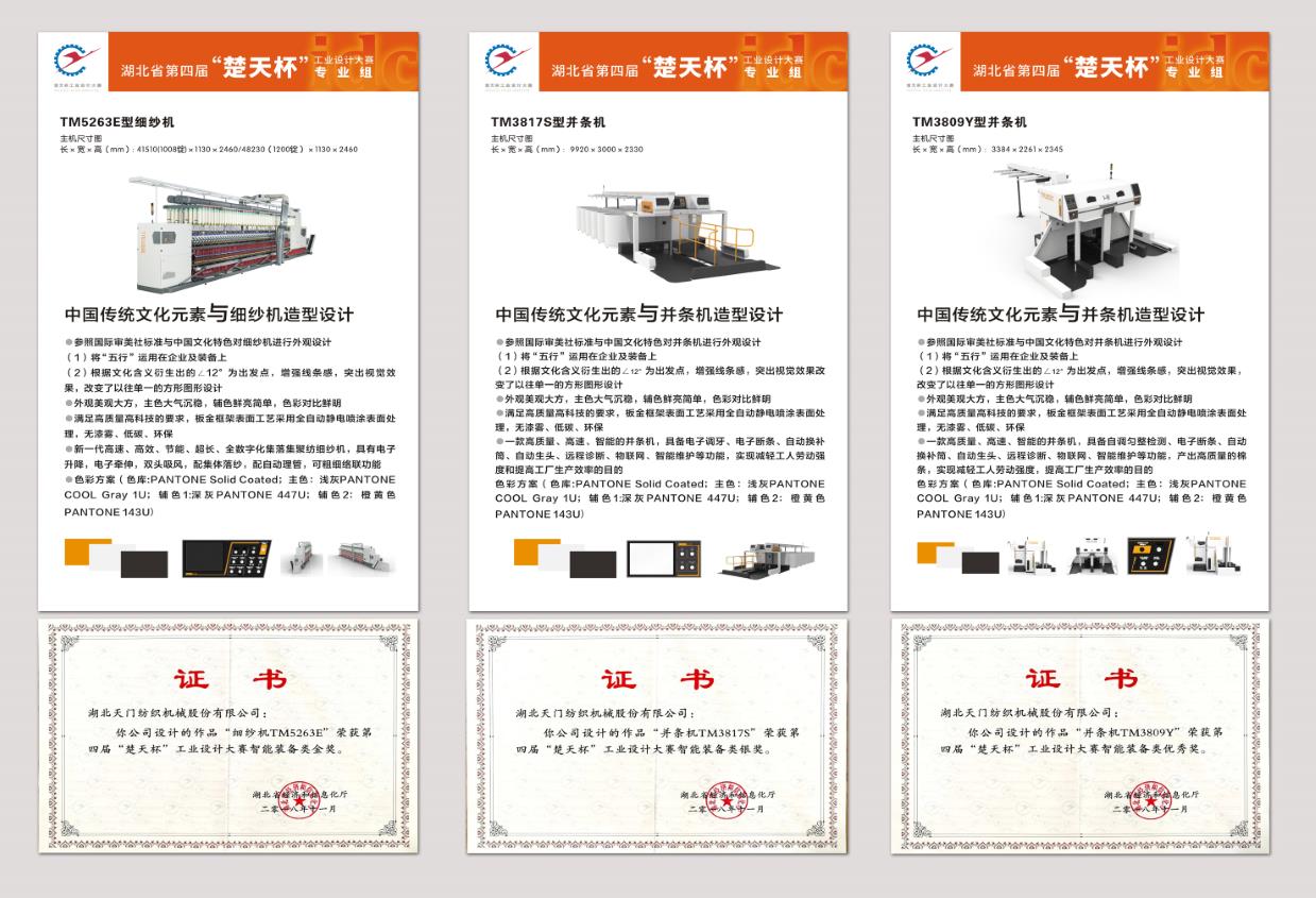 天門紡機(jī)獲獎(jiǎng)的三個(gè)產(chǎn)品申報(bào)平面設(shè)計(jì)和獲獎(jiǎng)證書