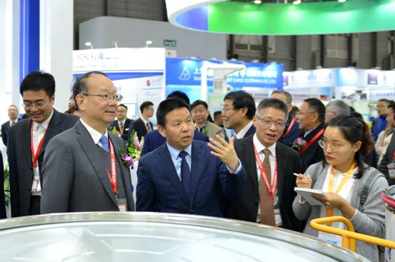 中國紡織工業(yè)聯(lián)合會(huì)黨委書記、秘書長(zhǎng)高勇(左1)聽取董事長(zhǎng)沈方勇介紹參展情況