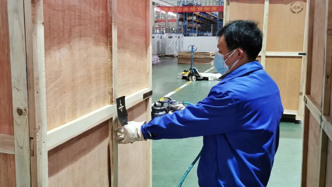 總裝車間主任彭文武對發(fā)貨產(chǎn)品包裝作邊角固定