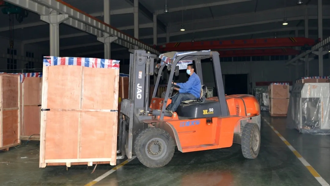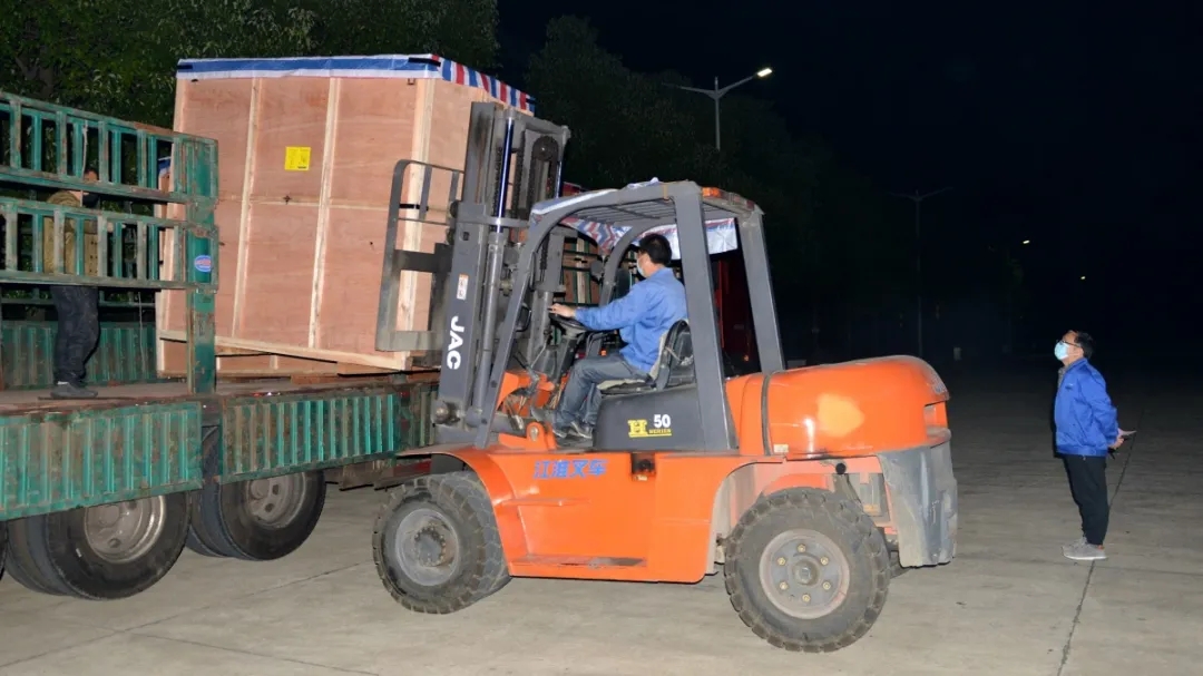 夜幕降臨,公司叉車司機姚順華抓緊時間將包裝好的產(chǎn)品進(jìn)行裝車作業(yè)