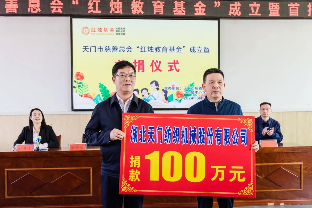 2024年3月21日,天門紡機董事長沈方勇出席在天門市盧市鎮(zhèn)盧家口中學舉行的天門慈善總會“紅燭教育基金”成立暨首捐儀式,同天門市慈善總會、教育局三方簽訂了《天門市慈善總會“紅燭教育基金”協(xié)議書》,并現(xiàn)場捐贈100萬元,用于獎勵盧市鎮(zhèn)優(yōu)秀教師和幫扶困難教師等公益活動,助力盧市鎮(zhèn)教育高質量發(fā)展。天門市人民政府副市長古玉麗,天門市民政局局長、市慈善總會會長謝金才,天門市教育局局長劉華陽,天門市慈善總會秘書長李貴清,盧市鎮(zhèn)宣傳統(tǒng)戰(zhàn)委員劉恒超以及盧市鎮(zhèn)部分教師代表等參加首捐儀式。盧市鎮(zhèn)黨委書記趙君波主持儀式。
