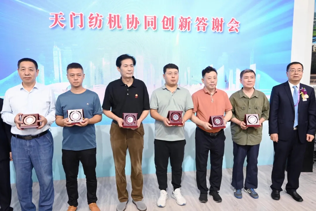 天門(mén)紡機(jī)總經(jīng)理焦倫進(jìn)宣布在協(xié)同創(chuàng)新中作出突出貢獻(xiàn)的單位和個(gè)人名單,中國(guó)紡織工業(yè)聯(lián)合會(huì)徐迎新副會(huì)長(zhǎng)為倪俊龍董事長(zhǎng)、陳冰教授、曹中華博士、陸惠文先生頒發(fā)紀(jì)念章,為臺(tái)達(dá)、匯川、南通五洲等3家企業(yè)代表頒發(fā)紀(jì)念牌。